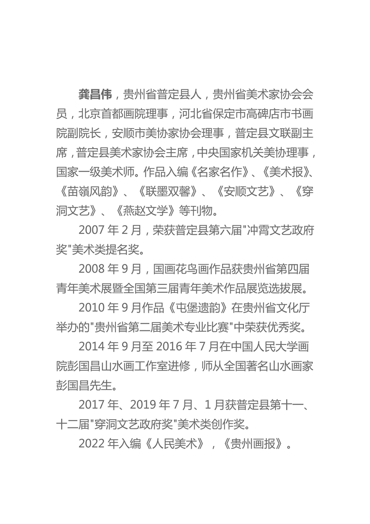 龚昌伟,贵州省普定县人,贵州省美术家协会会员,北京首都画院理事,河北省保定市高碑店市书画院副院长,安顺市美协家协会理事,普定县文联副主席,普定县美术家协会主席,中央国家机关美协理事,国家一级美术师。作品入编《名家名作》、《美术报》、《苗嶺风韵》、《联墨双馨》、《安顺文艺》、《穿洞文艺》、《燕赵文学》等刊物。